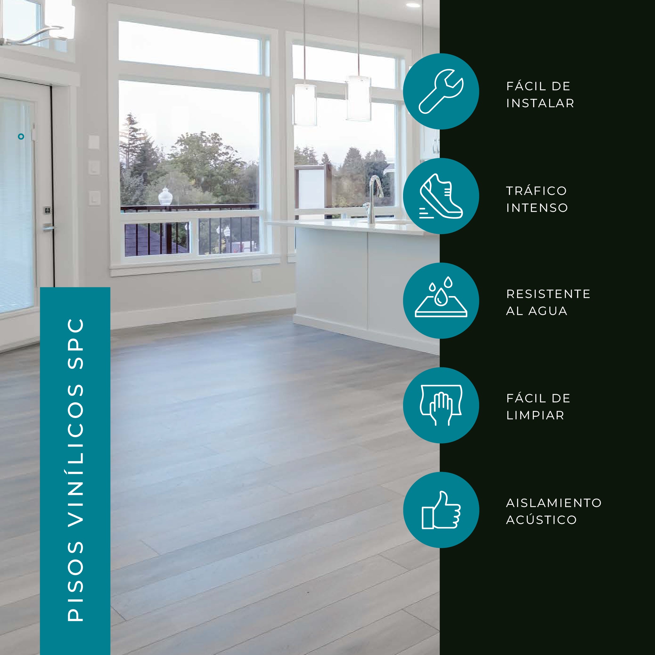 Contamos con una amplia gama de formatos y colores de revestimiento de piso vinílico SPC para renovar tus espacios. Se pueden instalar en ambientes comerciales y residenciales.